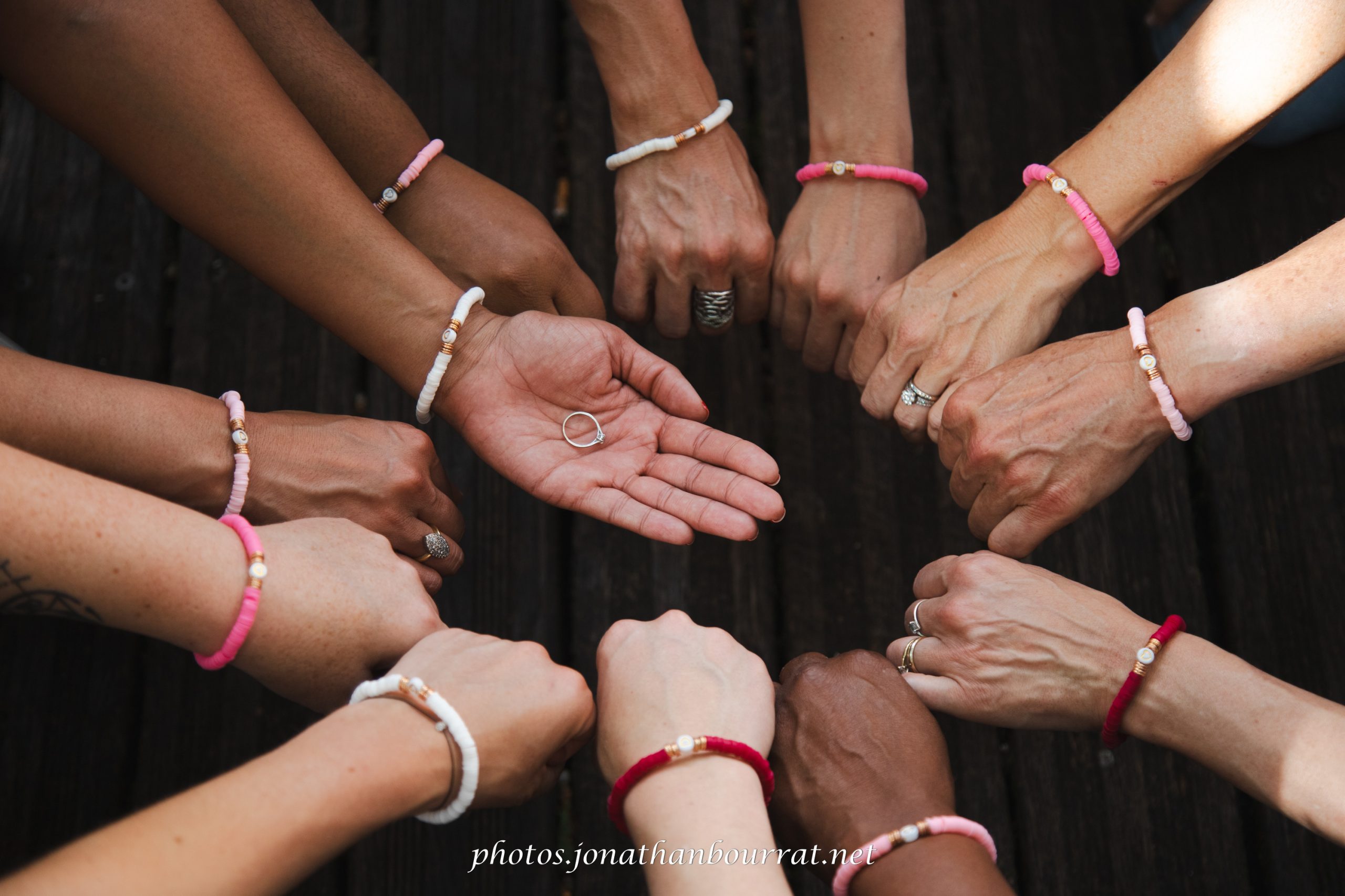 Par la suite nous nous sommes promenés, toujours en centre-ville en nous rendant vers la place des Jacobins et sa belle fontaine l’occasion de réaliser quelques clichés avec les ballons colorés apportés comme accessoires. Puis un passage du côté de la place des Célestins afin de réaliser des clichés avec la façade du théâtre comme arrière plan. C’est à cet endroit que nous fîmes un gros plan afin de mettre en valeur la bague de fiançailles de la future madame entourée des mains de ses copines. A noter qu’elles portaient toutes un bracelet rose, rouge ou blanc, une jolie façon de signifier leur unité!